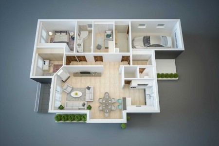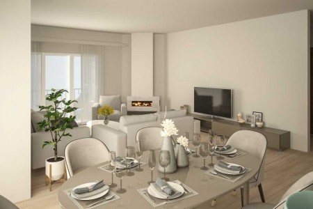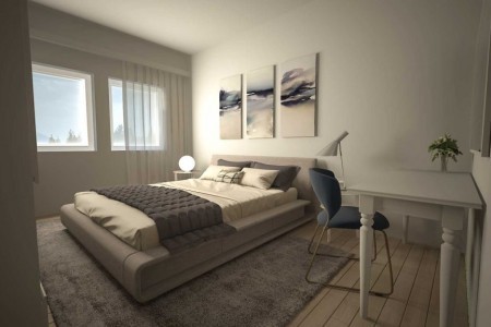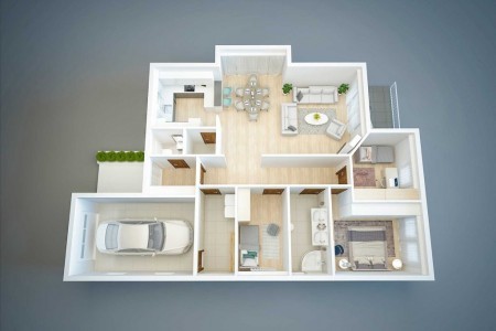 Kuhinja je otvorena ka trpezariji i dnevnom boravku, dok glavna spavaća soba sa još dve dobro dizajnirane sobe omogućava privatnost i udobnost.